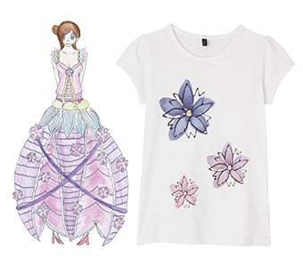 『夢と花あふれる☆角田』郡山 陽菜さん宮城県角田市立角田中学校2年<コメント>ドレスには、宇宙の町である角田をイメージした星や、手代木沼に飛来する白鳥の羽をイメージし、デザインに取り入れました。また、角田の花である「りんどう」をモチーフにドレスのスカートの部分に取り入れてみました。これらには、これから何があっても角田が星や白鳥のようにきれいで、りんどうの花や自然、そして夢があふれる町であってほしいという想いを込めました。チャリティーTシャツ2,600円(税込)